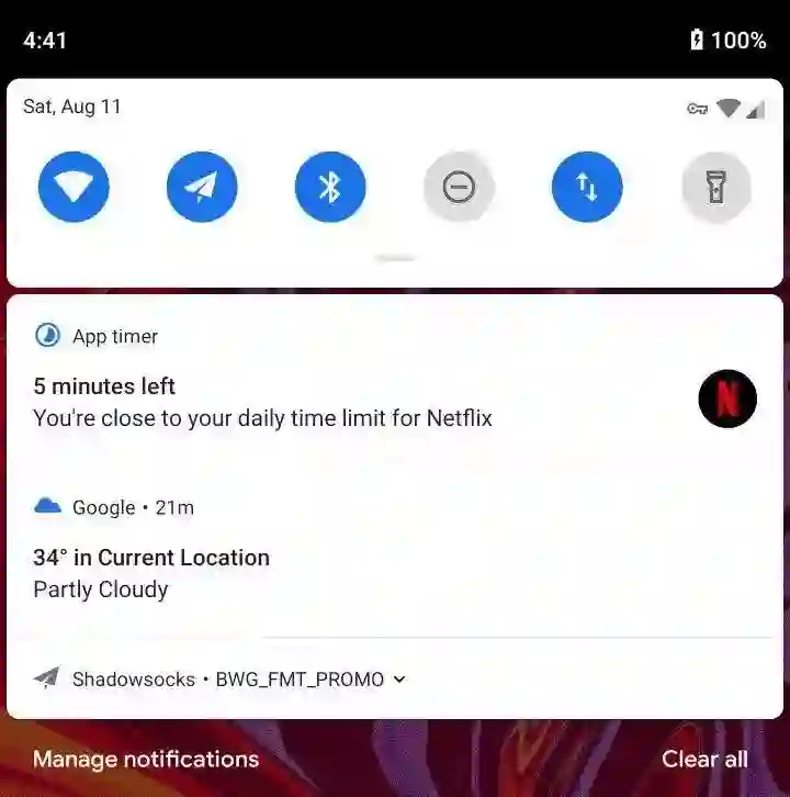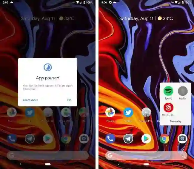 这里,派小队以 Netflix 为例,为其设置了 3 小时的使用时长限制。当 Netflix 剩余使用时间不足 5 分钟时,Digital Wellbeing 发出了时长剩余提醒。这个提醒的默认优先级为 最高,与 来电、低电量提醒同级。换句话说,即便我们在勿扰模式下刷剧,也能第一时间通过 Heads-up 样式的通知收到提醒。