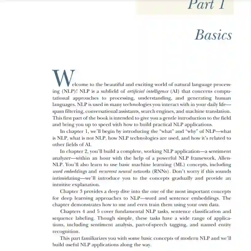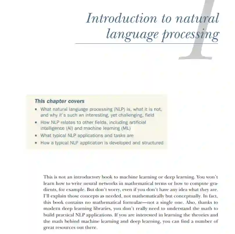 第1章首先介绍了NLP的“什么”和“为什么”——什么是NLP,什么不是NLP,如何使用NLP技术,以及NLP如何与人工智能的其他领域相关联。