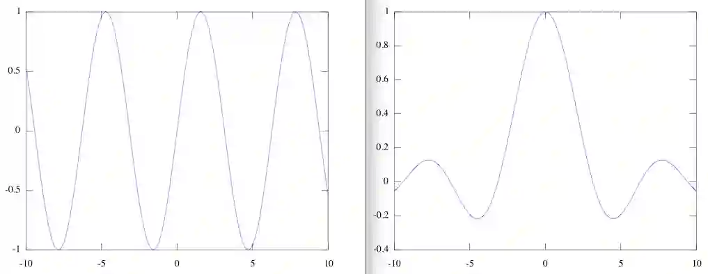 下图的左边是sin函数的图像,右边是sinc函数的图像,可以看到明显的水波纹特征。