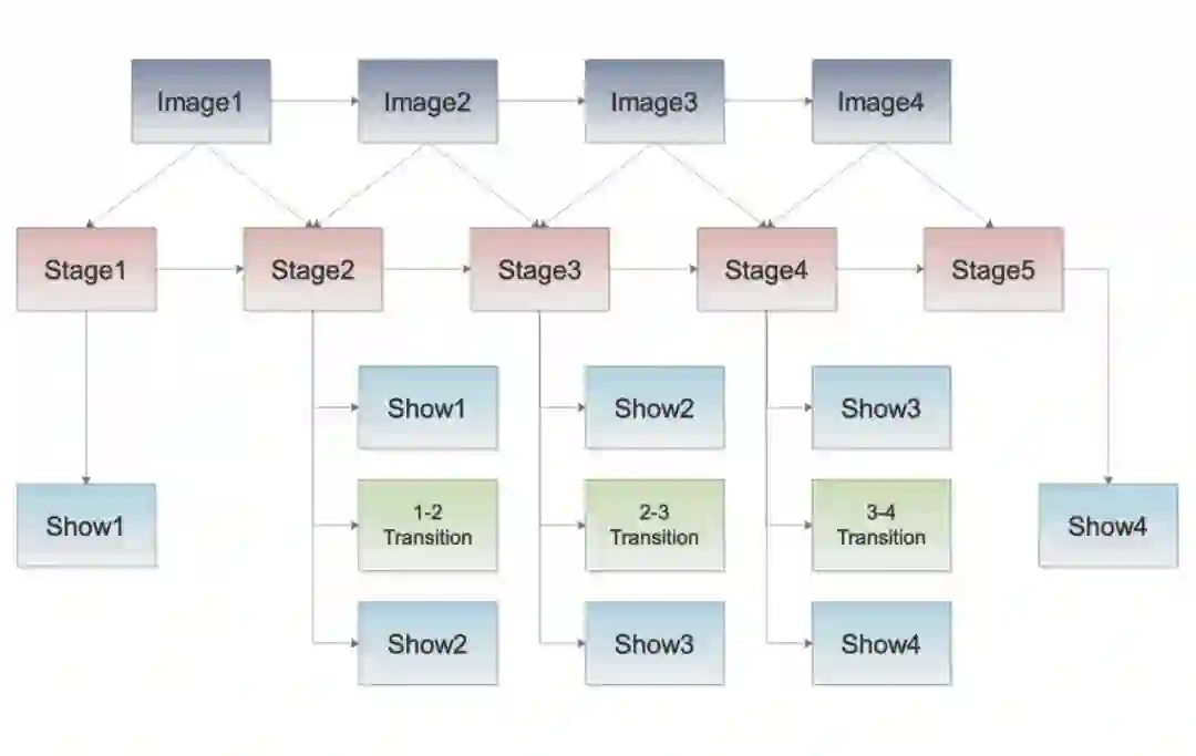 中间阶段的Stage,包括了过渡过程中前后两张图片的展示和过渡动画的时间戳定义。