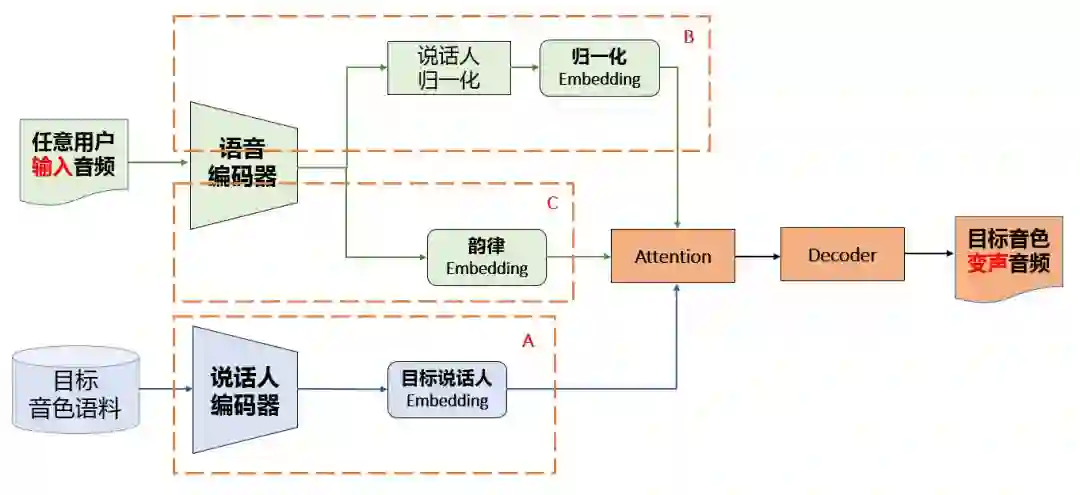 其中 A、B、C 组成了表征学习部分,后面的注意力机制和解码器组成了语音变声模块。这里可能令人疑惑的是,为什么说 B 和 C 两个嵌入向量能学习到内容与韵律,注意力机制又是怎样结合三大特征?