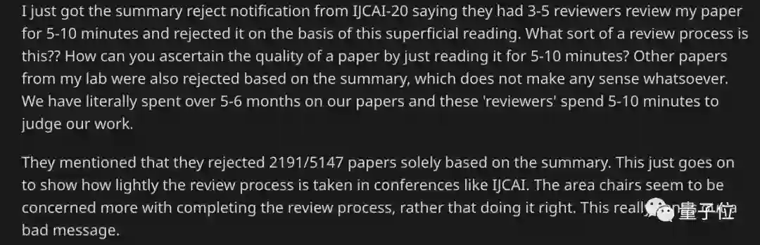 我实验室的其他论文也因此而被拒绝,这毫无意义。我们在论文上花了5-6个月的时间,而这些“评论员”花了5-10分钟来评判我们的工作。这只能证明,在类似 IJCAI 的会议上,审查过程是多么的轻松。