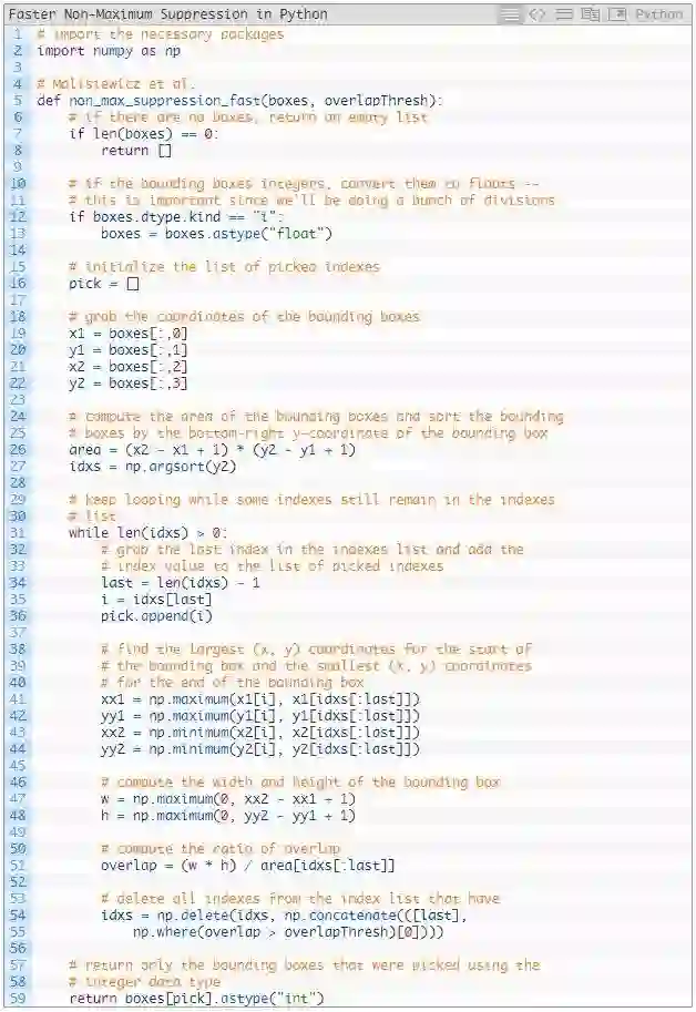 在本文中取而代之的是,Malisiewicz 博士用矢量化代码替换了这个内部循环,这就是我们在应用非极大值抑制时能够实现更快速度的原因。
