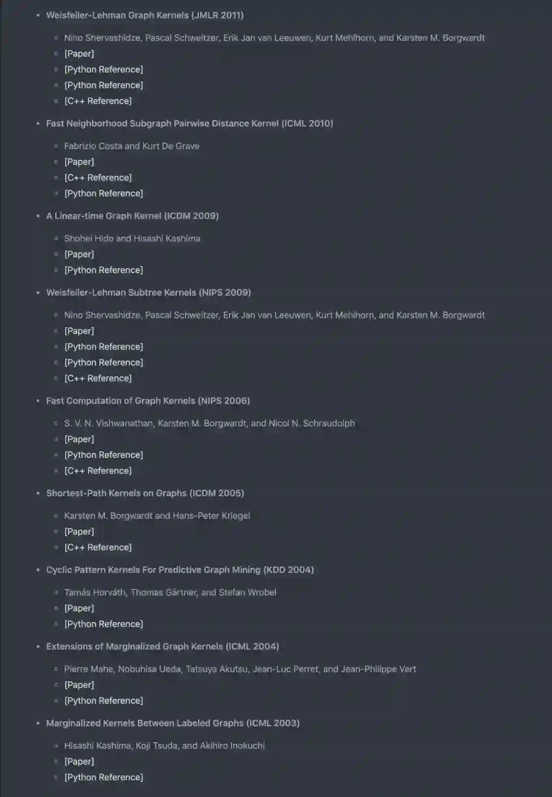 那么它和PyTorch Geometric有什么区别呢?PyTorch Geometric仅涵盖了深度模型,本仓库则相对更全一些。如果没有node和edge功能,本仓库中搜集的则隐式因子分解(如Graph2Vec,AWE)和统计指纹(如NetLSD)就很有竞争力了。