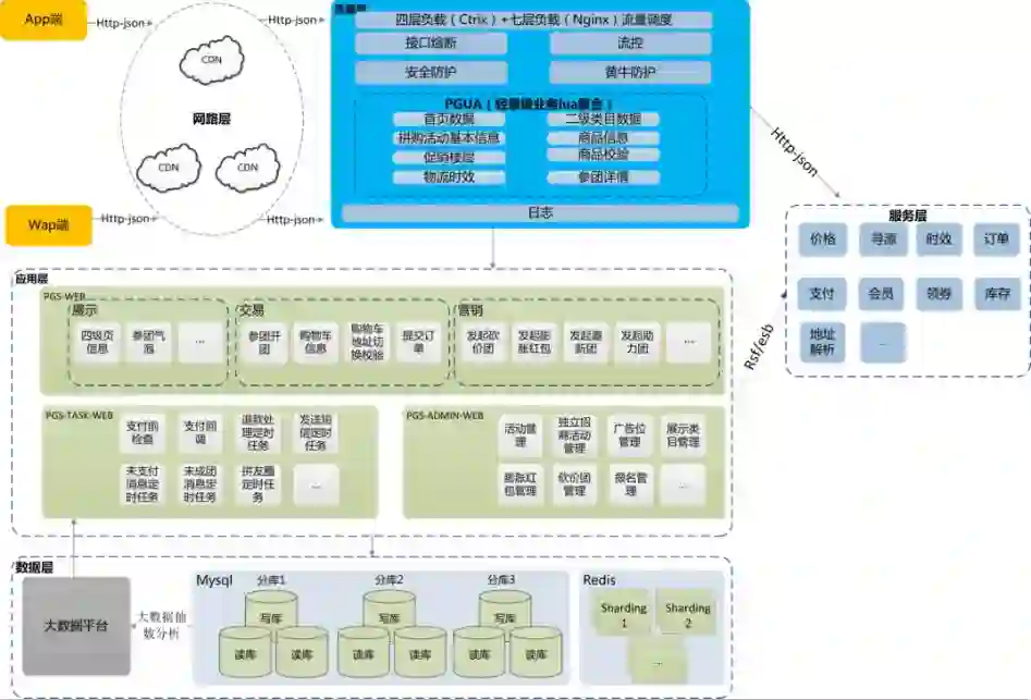 因此,系统优化所做的第一件事情就是对拼购系统架构进行了重构。一方面,进行横向切分,将系统分层,包括: