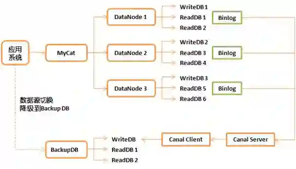 当 Mycat 出现问题时,我们可以通过应用层的数据源切换,降级为单库,保证业务。