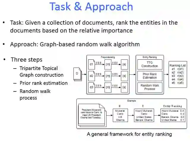 实体排序旨在自动计算实体在文档集合中的相对重要性。大多数现有实体排序的研究旨在从网络语料库中检索基于用户查询的实体排序,实体排序由用户查询和实体的上下文之间的相关性决定。 然而,实体可以根据它们在文档集合中的相对重要性直接排序,而独立于任何用户查询。 本文提出一种基于文档集合的实体排序图算法NERank+。 给定一个文档集合作为输入,NERank +首先构造一个图模型,名为主题三部图(TTG),这一个三部图由文档,主题和实体三种节点组成。 基于上述TTG模型,本文首先利用TextRank排序函数来计算实体的先验排序值,并且提出三种主题质量度量值来计算主题的先验排序值。 在此基础上,我们提出了基于图模型的元路径约束随机游走算法,将实体和主题的先验排序值传播至所有节点。 我们在多个真实数据集上对NERank+进行评测,并将其与基线方法进行比较,实验结果印证了NERank+算法的准确性。