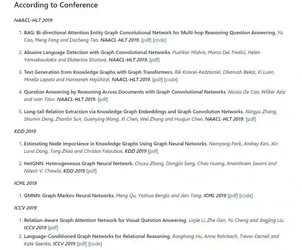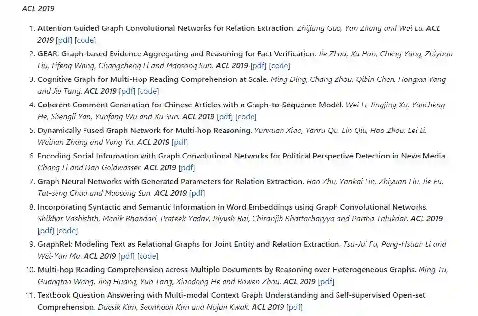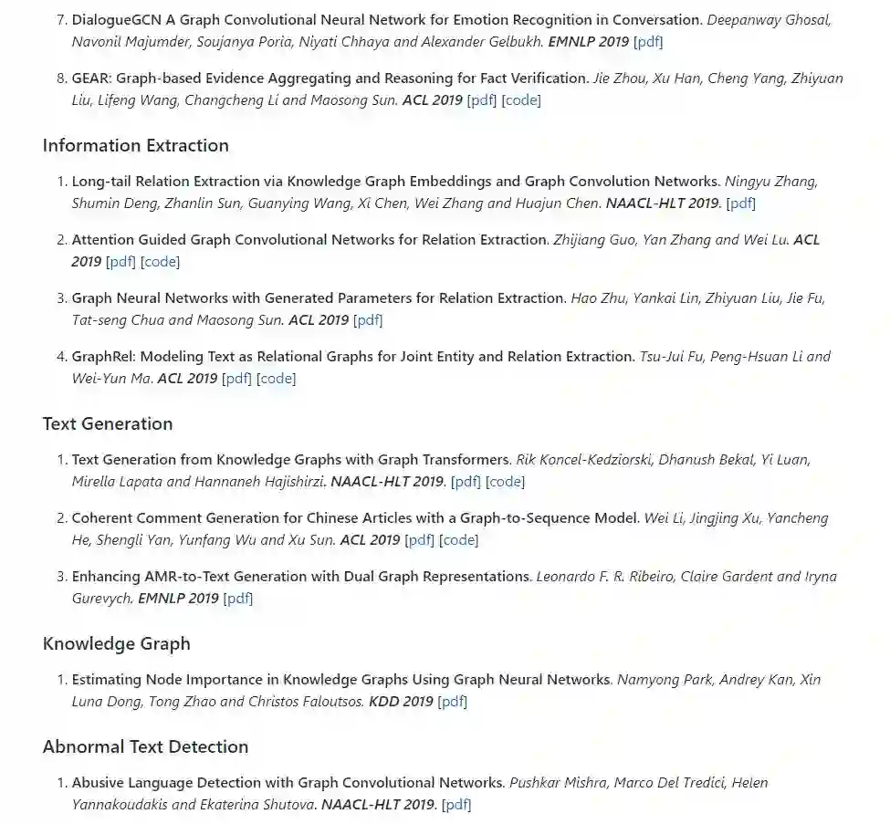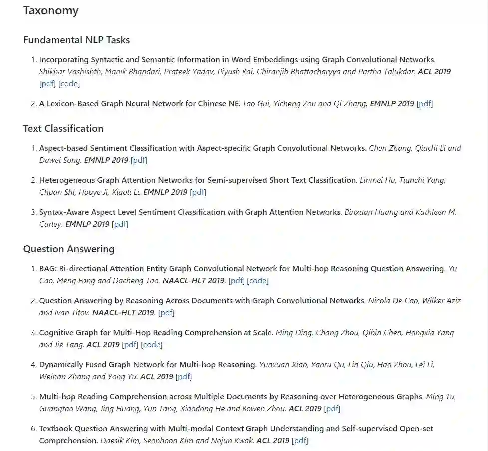 【导读】本资源整理了一些关于GNN方法在NLP领域应用的最新论文列表,供大家学习研究。主要包括Fundamental NLP Tasks、Text Classification、Question Answering、Information Extraction、Text Generation、Knowledge Graph等任务类别。另外也跟据会议整理了一些相关论文,包含的会议有NAACL-HLT 2019、KDD 2019、ICML 2019、ICCV 2019、ACL 2019等等。