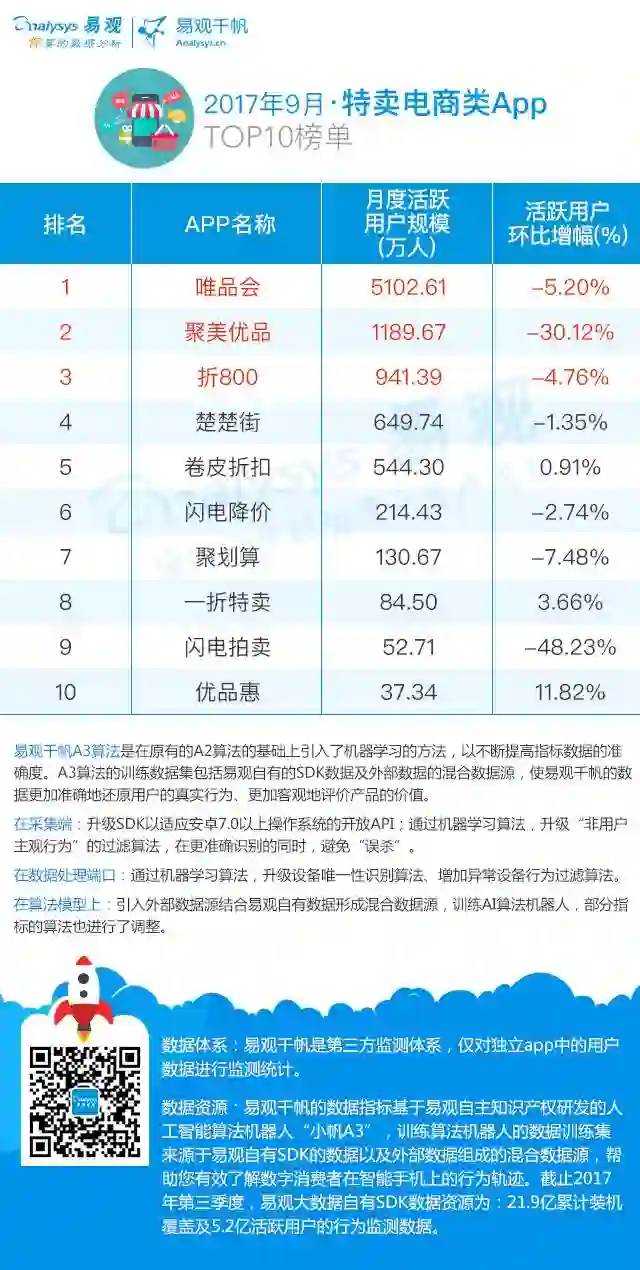 9月,特卖电商市场活跃度保持在常规波动范围,唯品会以5102.61万活跃用户保持相对稳定态势位居特卖电商榜首。聚美优品、折800以1000万左右活跃用户量分别位居榜单二、三。