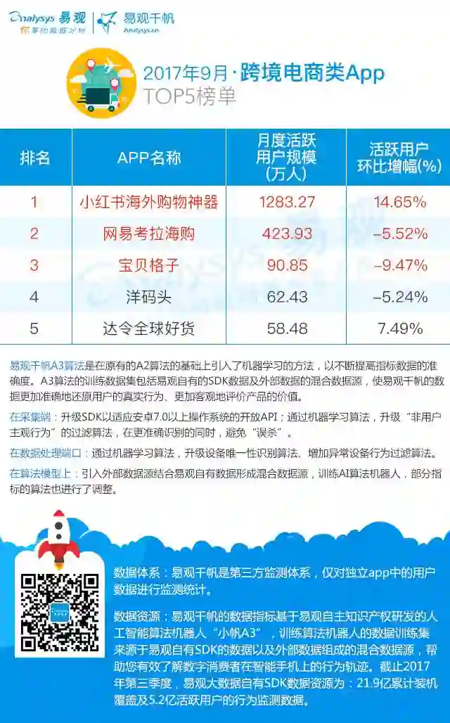 在第3季度最后的一个月,跨境电商依然延续着淡季的走势,从月活跃人数、人均启动次数、人均使用时长等指标上来看,主要的跨境电商平台中,大部分都有所下跌。但小红书是个例外,其月活跃人数自7月以来,呈现出了逐步增长的态势,9月的增幅尤其较为明显,致使其9月的月活跃人数已经超过了年中大促的6月。由此可见,社交驱动型的跨境电商,在用户运营方面确实有优势,但如何促成这种优势进行交易转化,如何利用用户优势推高自己的经营规模,是非常值得他们探究的问题。