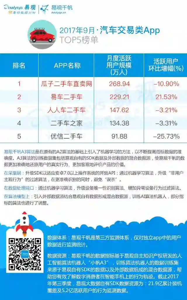 2017年9月,汽车交易以瓜子二手车的268.94万人月活规模位居行业榜首,易车二手车与人人车二手车分别以229.21万人、147.62万人的月活规模位居第二、第三位置。