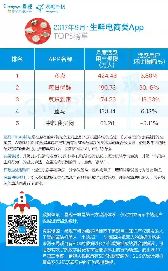 9月,多点继续领跑生鲜电商,得益于与线下物美,美廉美等超市的深度合作,通过绑定线下商超会员的形式,用户每次在线下超市消费都会采用App会员获得更多的优惠,使多点月度活跃用户达到424.43万人,环比增幅3.86%。每日优鲜月度活跃用户规模达到190.73万人,环比增幅30.16%,位列第二。随着每日优鲜布局办公室线下场景,推出便利购项目,纯线上模式的生鲜电商开始下沉线下场景,获取更多流量入口将成为新的趋势看点。京东到家月度活跃用户174.23万人,位列第三,虽与多点同属对传统商超门店的改造,但京东到家与多点打法略有不同,京东到家仅为线下门店提供线上平台接入与配送服务,在与门店的深度对接合作上没有多点做的深入,但这种平台合作模式使其能够布局更广泛。所以京东到家独立App月活规模略显不足,但由于京东到家接入京东App,并成为一级入口,京东体系内部流量的转化能力也不能小觑。