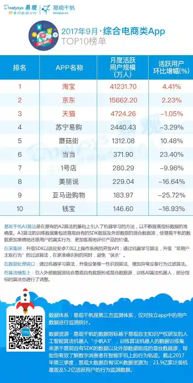 9月综合电商市场整体表现中规中矩。前三甲中,淘宝以超过4.1亿活跃用户位居榜首,环比小幅增长。京东保持稳定增长9月活跃用户接近1.6亿。天猫的活跃用户稳定在0.5亿。此外,钱宝依旧发挥社交属性优势,针对商品的品类、品质、服务,全方位升级用户体验,从而也与用户建立起扎实稳定的联系。