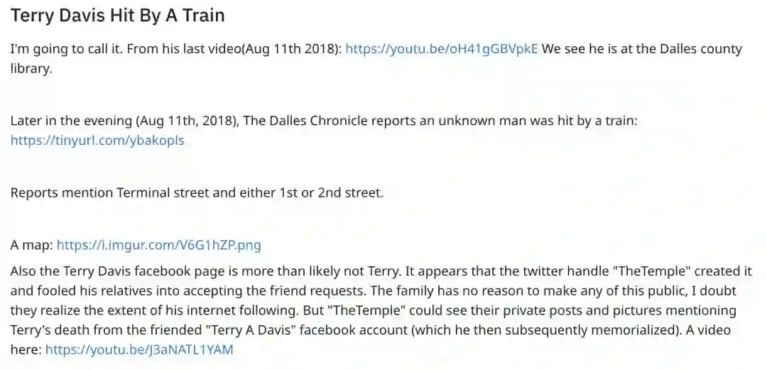 Terry Davis于11日在Youtube发布了最后一条视频,声称他当时位于Dalles的图书馆附近。而据Dalles警察局消息,当日晚上9点左右,一名不知身份的40多岁男子在第一和终点站街道被火车撞死。并不排除自杀的可能。