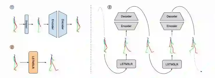 在长时间尺度上预测人的运动在各个应用领域仍然是一个很具挑战性的问题。在这个报告中,作者介绍了他们提出一个预测时空运动模型的新架构:Dropout Autoencoder LSTM (DAE-LSTM) ,这个架构能够在长时间尺度上合成较为自然的运动序列,而不会出现灾难性的漂移或退化。据作者介绍,这个模型由两部分组成:一个三层循环神经网络(用于模拟临时方面)和一个新型的自动编码器(通过随机删除训练中关节的信息,对人体骨骼的空间结构进行隐性恢复)。此外作者还提出一种新的评估方案,使用动作分类器来评估合成运动序列的质量。通过报告中的展示,可以看出这项研究相比之前的方法有更好的表现。