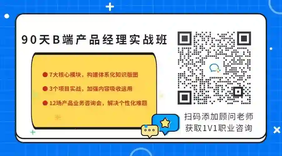 👇扫码添加顾问老师获取1V1职业咨询,更有《90天B端产品经理实战班》课程,帮你掌握B端产品建设的核心方法论,实现专业技能提升。