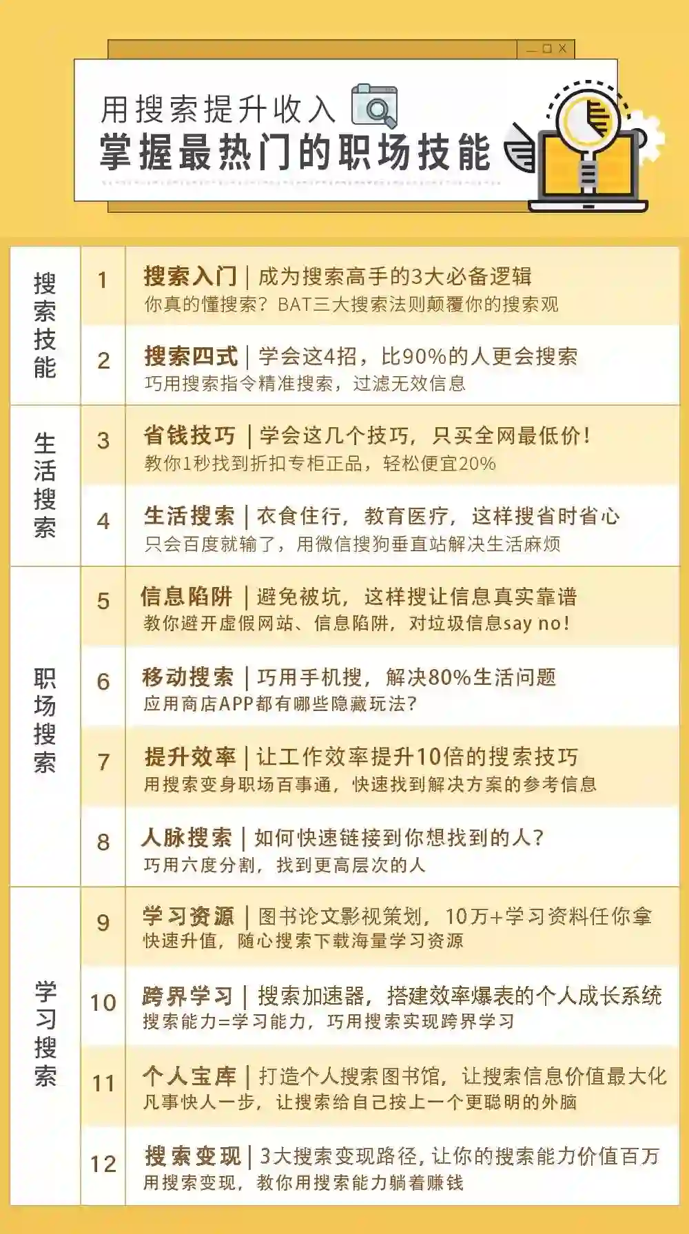 实用技能:完整交付独创3S搜索系统+BAT搜索逻辑,30+种搜索技巧,涵盖购物医疗理财人脉学习工作等各方方面面,快速找到任何你想要的信息资源人脉。