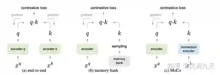 这里对损失函数简单解释下,对比学习的输入是对每一张图像进行两种不同的变换,经过特征提取之后会得到两种特征,对任意特征 来说,总会有一个特征 是其正样本(同一张原始图像的两种不同的数据增强得到的特征),而一个batch中的其他图像提取到的特征就是负样本。从原理上来说(其实是各种论文的实验结果),提高对比学习的效果就是提供足够大的batch size、研究更加有效的不同预处理方式(使得经过变换后的两张图像既能保留图像最本质的信息,又尽可能不一致)以及增加模型(encoder)表达能力。下面重点讲一下对比学习领域内Moco和Simclr两个最具代表性以及影响力的文章。
