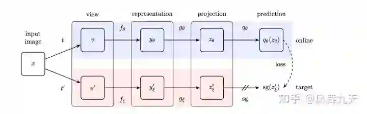 刚刚有提到,如果直接最大化两张图像特征的距离,模型很容易陷入坍塌。但是也有一些文章进行直接进行特征重构但是却能收敛(其实从原理上并不是很清楚收敛原因)。这里主要是介绍BYOL和SimSiam。
