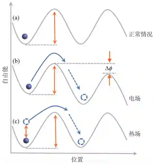 我们通常希望在较小的外场作用下,目标离子能在固体中发生迁移,并且固体材料的结构框架不变或者变化很小,因此可以实现离子的多次可逆迁移。比如锂离子电池,我们希望电池可以充放电上千次而性能不衰减,这就要求每一次充放电后电池材料的结构能恢复到原来的状态,而一旦材料结构被破坏了,就会引起电池容量衰减,降低使用寿命。通常,离子的迁移是在各种梯度力的作用下进行的,比如浓度梯度、(电)化学势梯度、电场梯度等。梯度驱动力可以是多种驱动力共同作用,也可以是彼此间相互竞争的结果。从势阱的角度来看,这些梯度力引起的势能变化(外在的)可以与局域原子结构(内在的)决定的势阱相叠加。梯度力的存在会使势阱朝着特定的方向倾斜,因此,离子从较低的一侧势阱中迁移出来的概率增大,使得离子从一个平衡位点迁移到另外一个平衡位点。这就像是杯子里装了水,如果把杯子倾斜,水就会从较低的一侧流出来。如果是电场驱动的离子迁移,电场强度为E,离子之间距离为λ,离子所带电荷为Q,则势阱一侧的倾斜导致的势垒降低了Δϕ=2EλQ,如图1(a,b)所示。关于固体中离子迁移更加详细系统的描述可以查看相关专著和综述文献[1—3]。因此,梯度力的驱动具有特定的方向性,形成净的宏观的扩散现象。比如,在锂离子电池材料中,放电过程就是浓度梯度和化学势梯度共同驱动的碱金属离子扩散过程,锂离子从负极经过电解质,扩散至正极,同时驱动电子经过外电路,对负载供电;充电过程则是在外电场作用下驱动锂离子从正极材料中迁移回到负极。