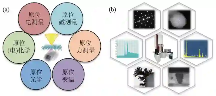 图2 原位研究方法示意图(a)原位TEM中可以施加的不同外场;(b)TEM 不同的成像及谱学功能:衍射、形貌、衍衬像、原子像、能谱、能量损失谱等