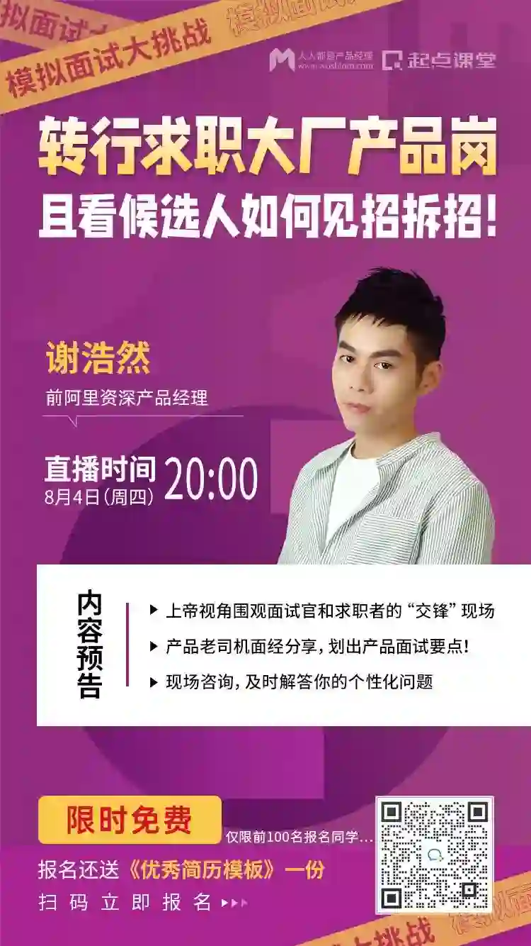 8月4日(周四)晚上20:00 前阿里资深产品经理@谢浩然将会上线为大家带来满满干货的直播课程哦!