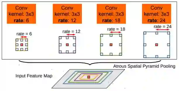 带孔空间金字塔池化由具有不同的采样率的带孔卷积对相同的输入卷积组成,用于检测空间模式。特征图在不同的批次中处理,并使用双线性插值连接以恢复输入的原始大小。输出由全连接的条件随机场计算特征和长期依赖性之间的边缘以产生语义分割。