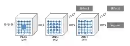 蓝色的是卷积滤波器,D是膨胀率。在第三和第四阶段之后,应用 SE-Loss (语义编码损失)来检测对象类。一个最后的seg-loss(像素丢失)用于改进分割性能。