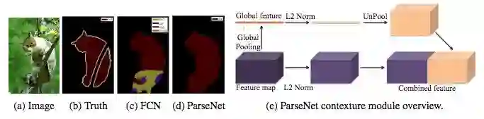 W. Liu et al. (2015) 发表了一篇论文,解释了J. Long et al. (2015)的FCN模型的改进。这组作者说,FCN模型通过专注于生成的特征图,在其深层中丢失了图像的全局背景。ParseNet是一个端到端的卷积网络,可同时预测所有像素的值,避免将区域作为输入来保持全局信息。作者使用一个模块将特征图作为输入。第一步使用模型生成特征图,用池化层把这些特征图缩减为单个全局特征向量。使用L2欧几里德范数对该全局向量进行归一化,并且将其unpool(输出是输入的扩展版本)以生成具有与初始尺寸相同的新特征图。第二步使用L2欧几里德范数对整个初始特征图进行归一化。最后一步是连接前两个步骤生成的特征图。归一化有助于对连接的特征图的值进行缩放,从而获得更好的性能。基本上,ParseNet是一个FCN的变体,用该模块取代了卷积层。它在PASCAL-Context挑战中获得了40.4%的mIoU分数,并且在2012年PASCAL VOC分割挑战中获得了69.8%的mIoU分数。