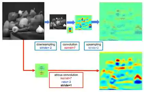 标准卷积用于低分辨率输入(顶端)与采样率为2的带孔卷子用于高分辨率输入的提取特征对比(底部)。