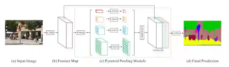 输入图像(a)是由CNN处理生成的特征映射(b)。他们提供了一个金字塔池模块 (c) ,并生成了一个像素级别的预测。
