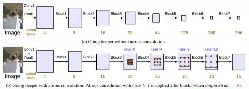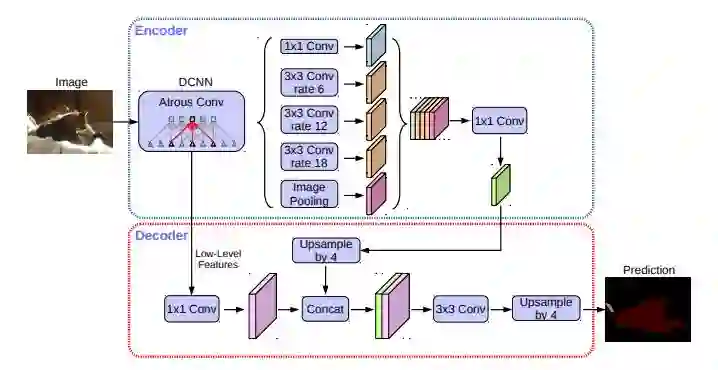 chen等人(2018)最终发布了结合了编码器 - 解码器结构框架的Deeplabv3。作者引入了空洞可分离卷积,它包含深度卷积(将输入的每一个通道进行卷积)和逐点卷积(1*1的卷积和深度卷积作为输入)。