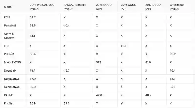 各个模型在2012 PASCAL VOC (mIoU), PASCAL-Context (mIoU), 2016 / 2017 COCO (AP and AR)和 Cityscapes (mIoU)数据集的得分综述。