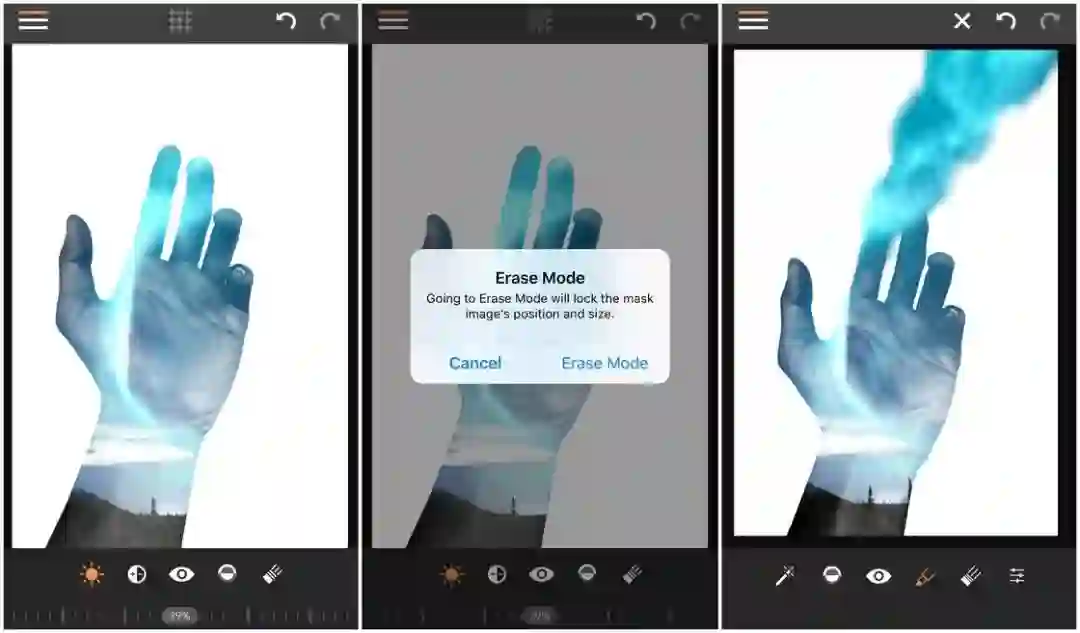 最后,如果你想在这基础上实现异形效果,可以通过「蒙版」界面下方最右端的按钮,进入擦除模式,里面内置了数个橡皮擦工具,你可以将空白部分擦去,留下想要背景即可。但要注意的是,一旦进入擦除模式,蒙版就会被锁定,不能再缩放和调整画面,所以最好是首先把画面调整好再进行擦除。