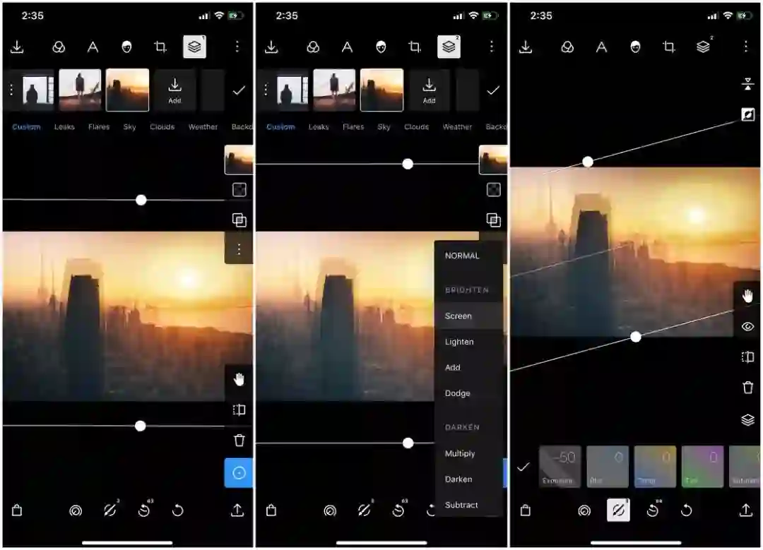 在「蒙版」中导入这样的一张照片后,效果就非常显然了。之后你可以随意将蒙版变换大小或移动位置,如果效果不理想,你还可以通过三个界面下方的曝光、对比度等工具对每一个图层的效果进行微调。