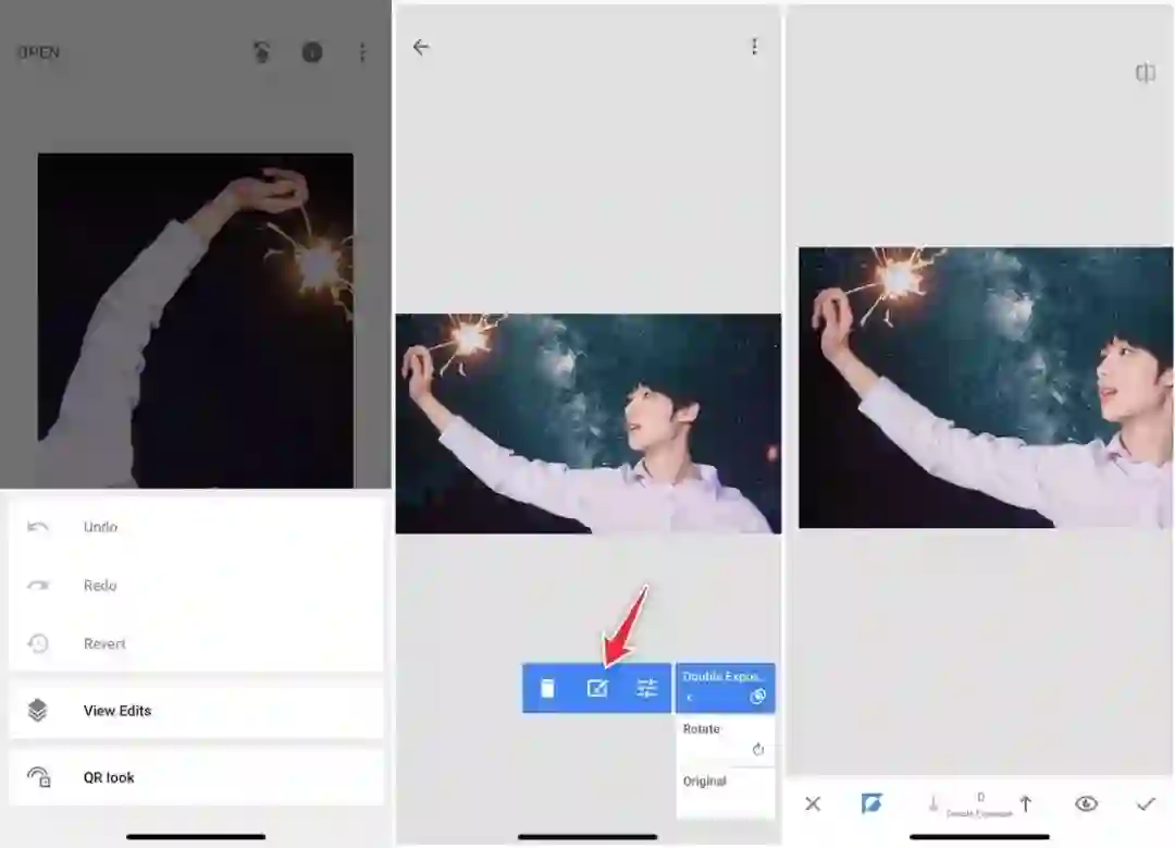 如果你只想把双重曝光应用在照片的某个部分,你可以在调整之后返回到 Snapseed 的主界面,点击右上角的历史记录,点击双重曝光所在的图层,第二个选项即是橡皮擦工具,你可以对双重曝光的效果进行添加或擦除。