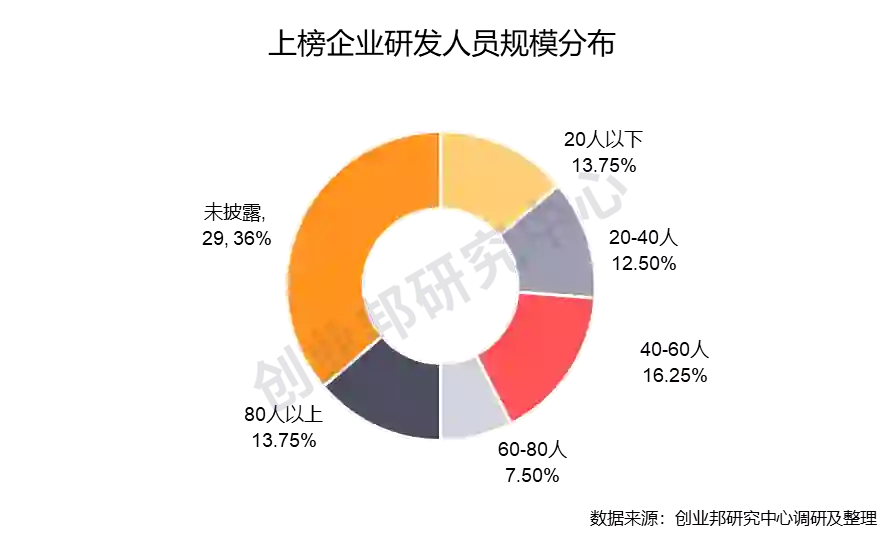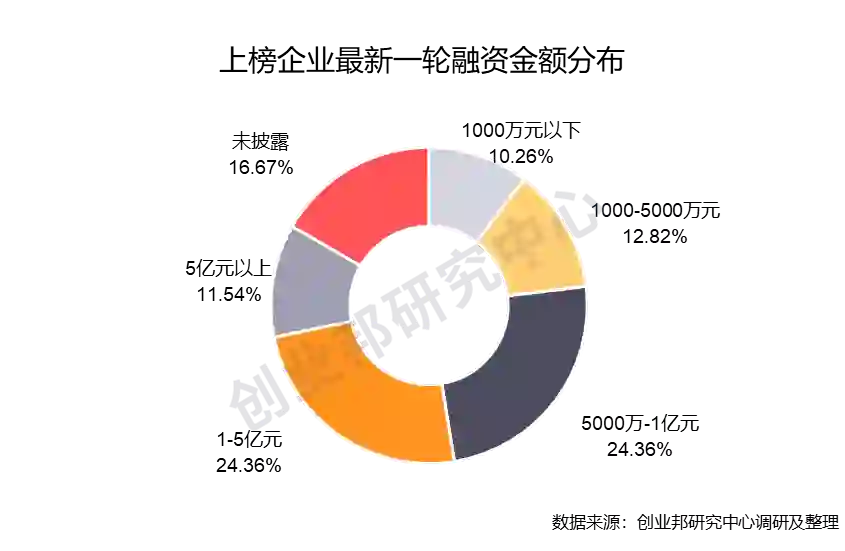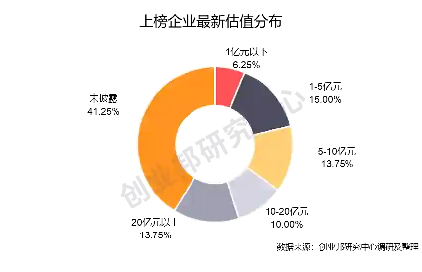 在已披露的上榜企业中,最新估值的平均值为14.97亿元。其中,最新估值在1亿-10亿元之间的企业占比约为29%,估值在10亿元-20亿元的企业占比为10%,20亿元及以上的占比高达13.75%。