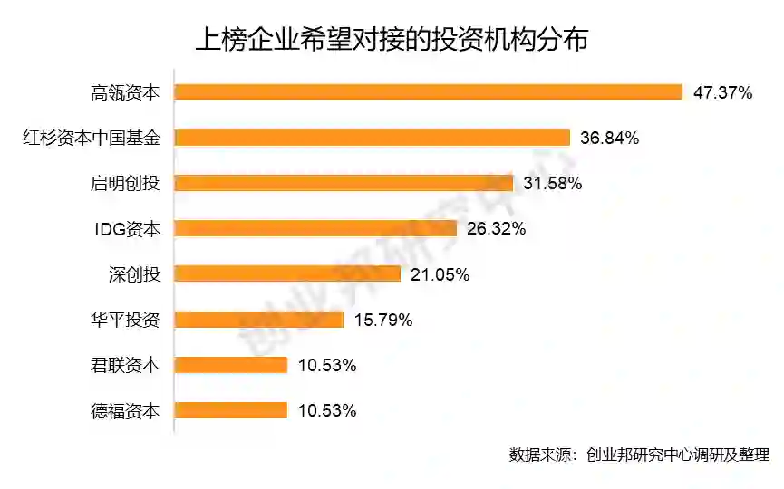 近30%的上榜企业有想对接投资机构的意愿,希望得到知名投资机构或产业资本的加持。其中,高瓴资本是众多上榜企业想要对接的机构首选,占比为47.37%,其次为红杉资本中国基金、启明创投、IDG资本及深创投等。