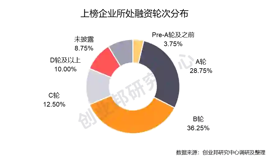 上榜企业最新融资轮次以B轮及A轮占比最高,分别36.25%和28.75%,其次为C轮占比12.50%,D轮占比10%,Pre-A及以前的企业占比3.75%。上榜企业融资轮次大多在中早期,处于快速发展阶段;对资金需求较大,吸金效应明显。
