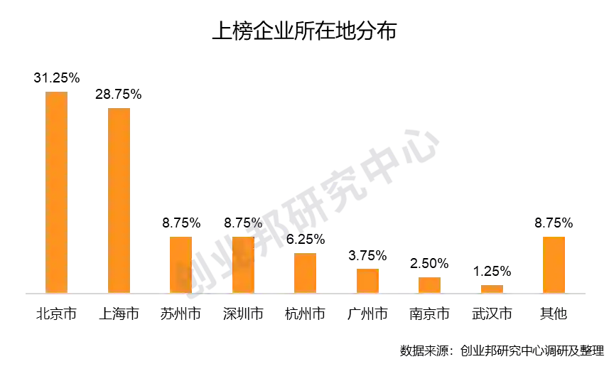上榜企业在空间分布上较为集中,北京和上海两地的企业占比高达60%,分别有25家和23家企业上榜,其次为苏州、深圳和杭州,上榜企业分别为7家、7家和5家,此外,广州、南京和武汉等地均有企业上榜。