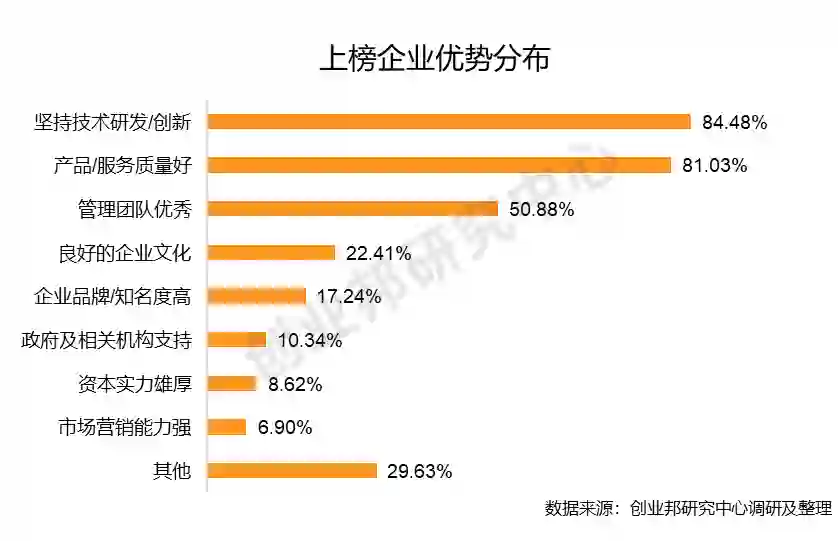 在上榜企业优势自评方面,排名前三的是坚持技术研发/创新、产品/服务质量好和管理团队优秀,占比分别为84.48%,81.03%和50.88%。医药企业是典型的创新驱动型企业,只有不断的推出更好的产品,才能保持其竞争优势。优秀的管理团队对行业有着深刻的理解和洞察力,能够带领企业更好的发展。