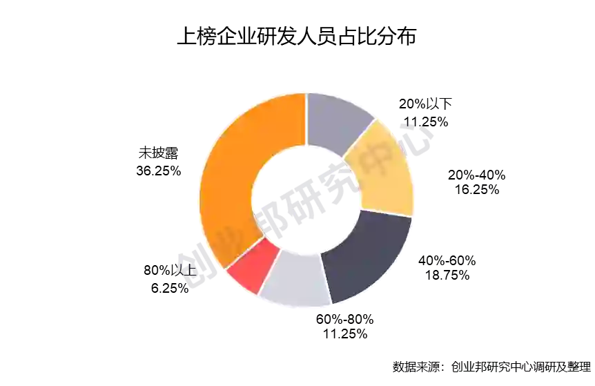 医疗行业是一个壁垒较高的行业,研发投入大:在已披露的上榜企业中,研发人员数量占企业员工数量的均值为47.06%。研发人员占比在20%以下的企业有9家,占比在20%-80%之间的企业有42家。