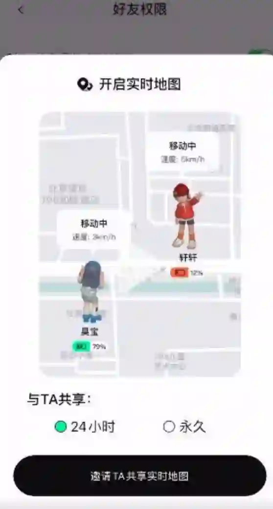 啫喱支持好友共享实时地图,可以选择24小时也可以选择永久地共享时长,该功能正是此前也爆火了一段时间、基于LBS的社交产品“Spot”。
