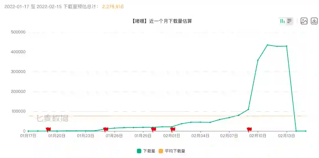 根据七麦数据显示,“啫喱”下载量在App Store上线后的第7天开始出现了明显上涨的趋势,到2月11日,其日下载量达到了峰值,为494966次,登顶App Store的免费排行榜,这个日下载量的峰值接近了字节旗下社交产品“多闪”在同时间段内的最高日下载峰值,啫喱在近一个月内的预估总计下载次数也达到了227万次,可见这款社交产品在前期的数据表现相当亮眼。