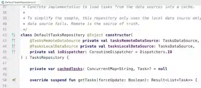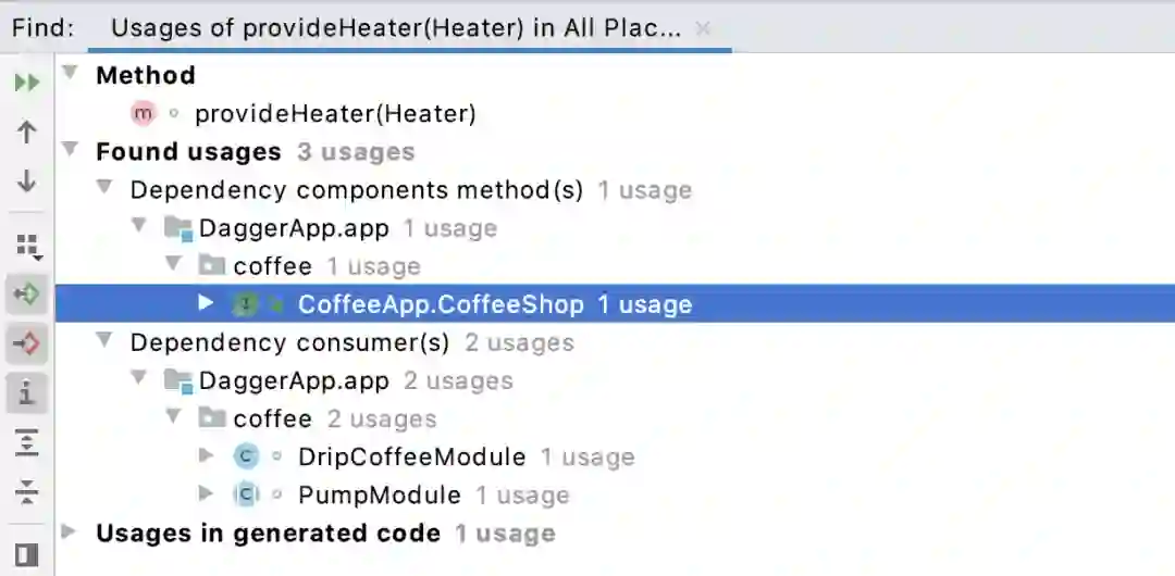 最新的 Android Studio 4.1 版本 (目前在 Canary 预览版发布渠道可以下载) 为我们带来了一个新的 "间距图标" (在编辑器和代码行号之间的图标,如下图所示),通过点击这个图标,我们可以轻松地在 Dagger 的关联代码间进行导航,包括依赖项的生产者、消费者、组件、子组件以及模块。您同样可以在 Find usages 中获取相同的信息。