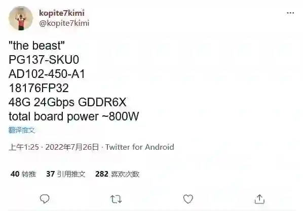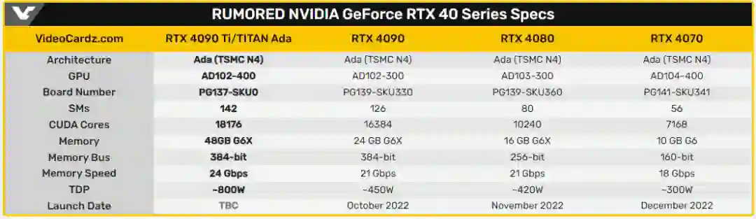 据这位名叫“kopite7kimi”的爆料者的说法,新显卡将拥有恐怖的 18176 个 CUDA 数,比 RTX 4090 多出 11%,可集成 48GB GDDR6X 显存(384bit 位宽),再加上 24Gbps 的速度,总带宽能到 1.1TB/s,可以轻松应对 8K 游戏带来的压力。假设 SM 单元底层设计不变,那么 PG137 就有 142 个光追核心、568 个 Tensor 核心,FP32 单浮点性能至少比 RTX 3090 Ti 高出 70%,性能提升可以说非常可观。