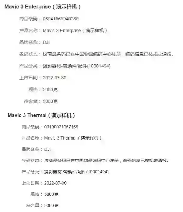 此外,有大疆 Mavic 3 Enterprise 和 Mavic 3 Thermal 两款产品已在中国物品编码中心完成了注册通报,从产品名来看前者就是大疆 Mavic 3 企业版和带有热成像功能的 Mavic 3 无人机,企业版可能会加入探照灯,喊话器和夜航灯等工具。
