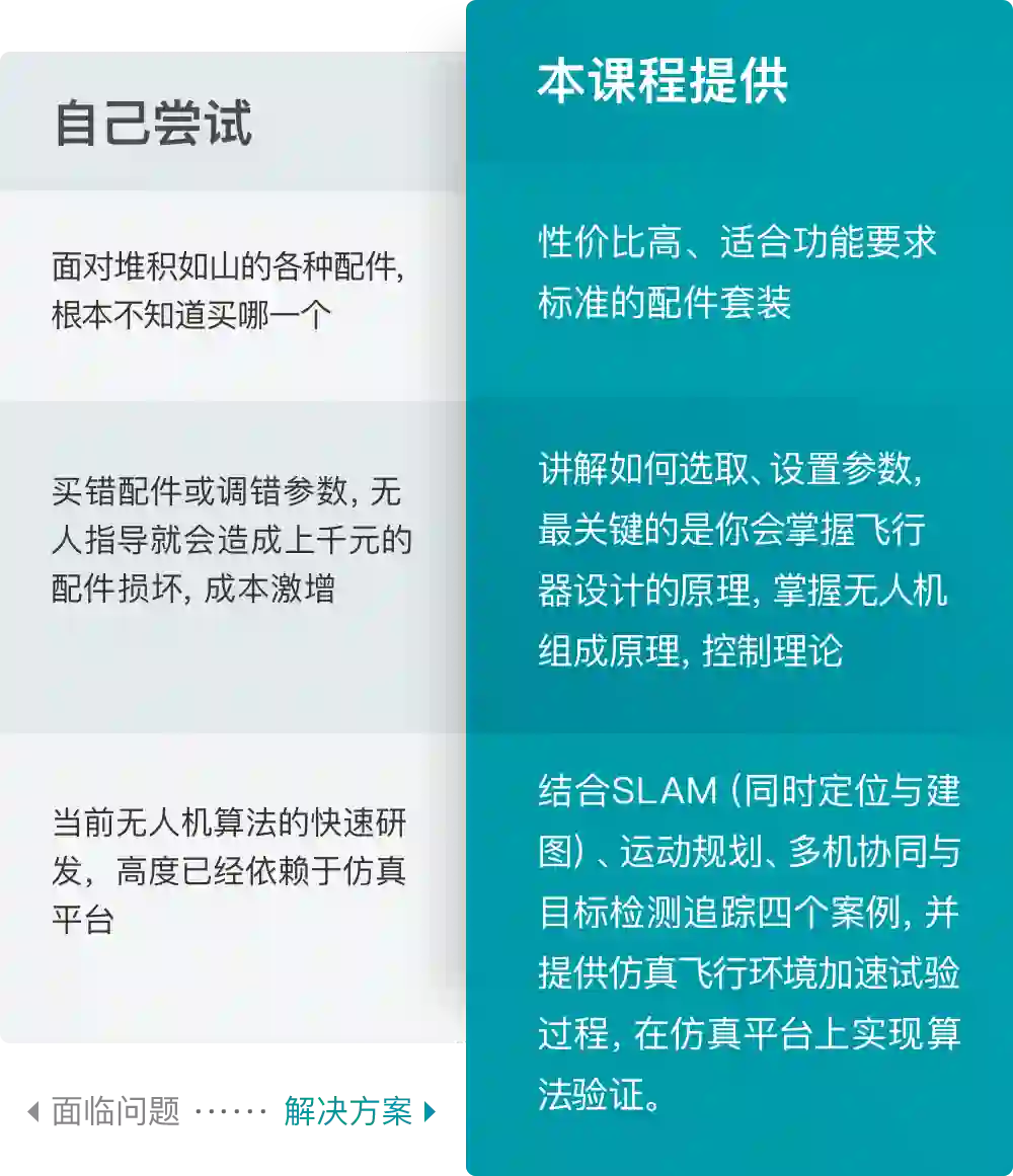 我们的课程并不是简单的拼装课程,更涉及到飞行器设计、仿真平台搭建和算法实现的整体流程。我们课程将会教你无人机的基本组成、飞行原理、控制理论、状态估计、同时定位与建图、运动规划、目标检测追踪与多无人机协同;