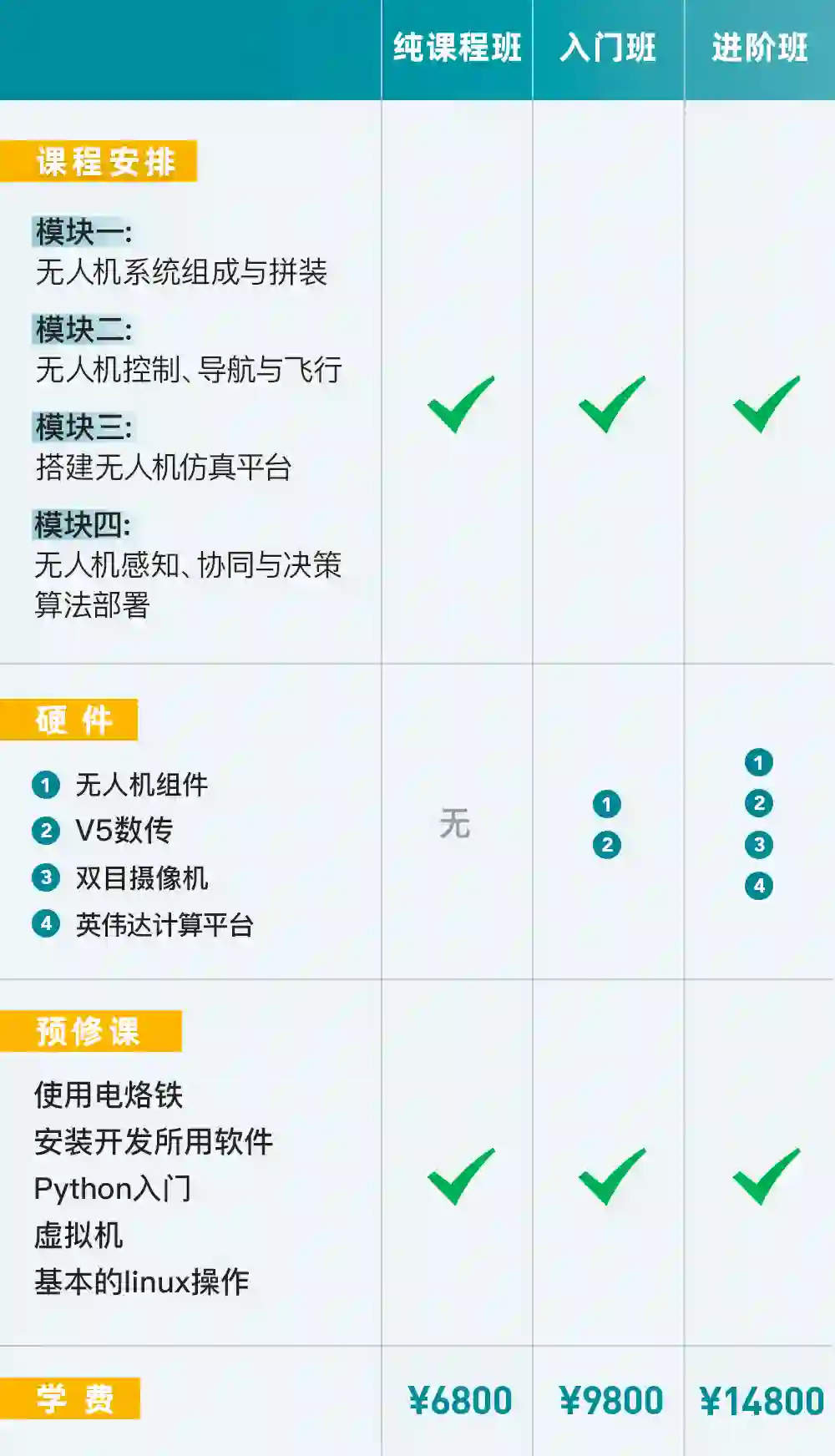 但是学员自行购买的无人机等设备与以上型号不符,我们则不提供硬件方面的答疑。