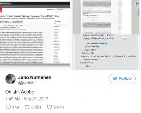 Adobe产品安全事件响应团队(PSIRT)在发布了PGP公共密匙还把私人密匙也公布了出来,这意味着该PGP签名不再安全,获得密匙的人则能借此盗取邮箱的通信内容。